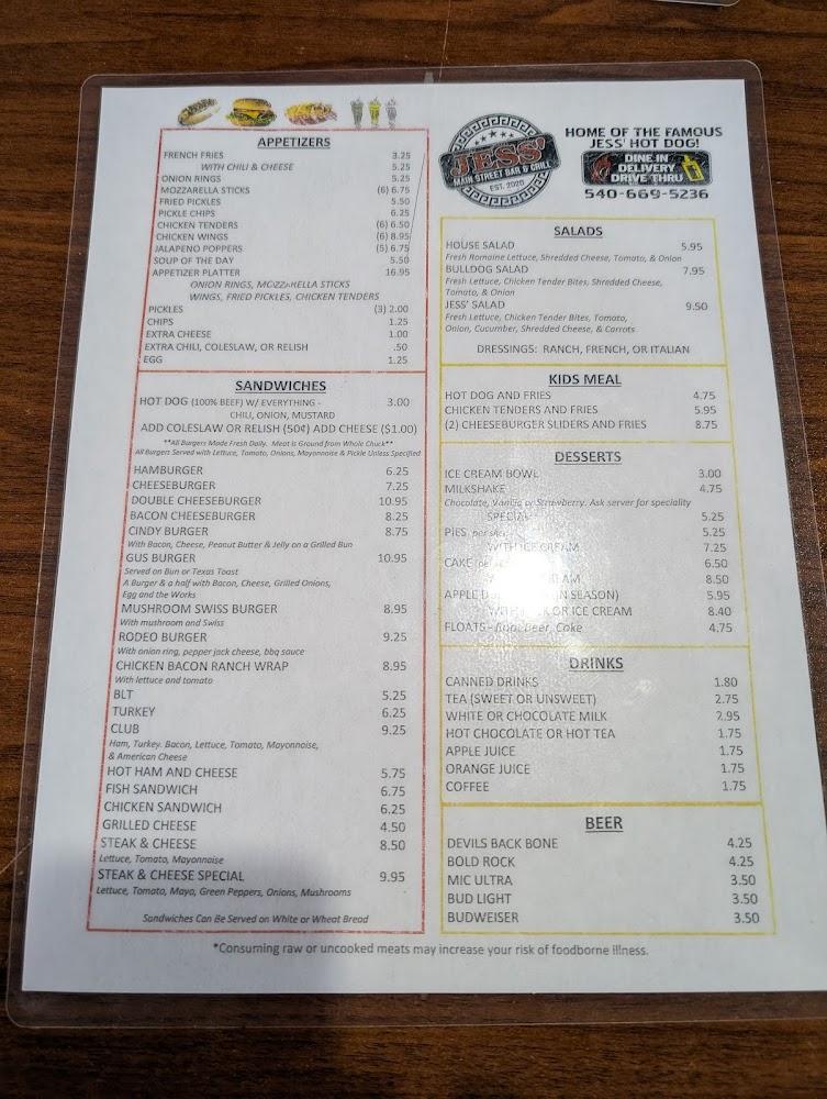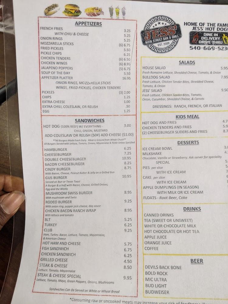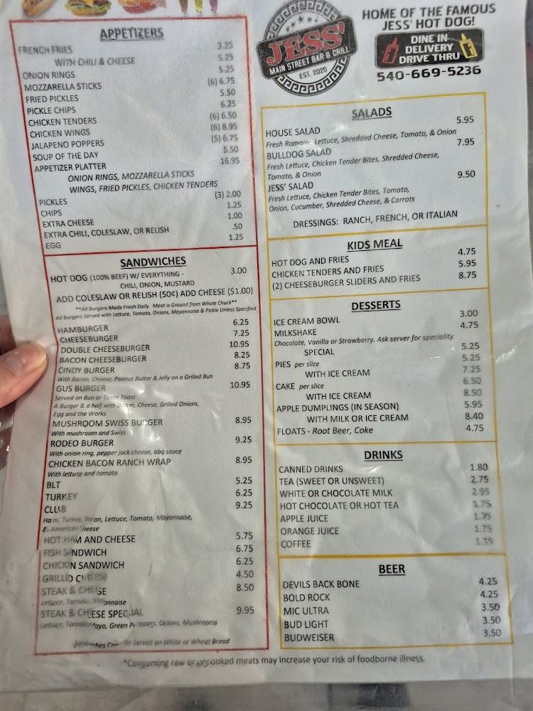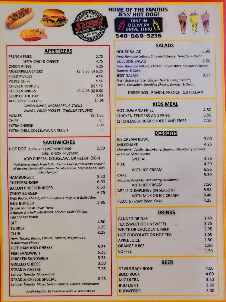 Discover Jess' Main Street Bar and Grill, a cherished local eatery in Luray, VA, where flavor meets tradition! Established in 1922, we proudly serve our signature Jess' dog topped with homemade chili, mustard, and onions, alongside customizable toppings to suit your taste. Our menu also features fresh ground beef burgers, delectable sandwiches, and a variety of sides like fried pickles and loaded fries. Enjoy a quick meal in our cozy setting or grab your favorites to go. With accessible dining options and swift service, we cater to everyone. Experience a piece of history with every bite at Jess'!